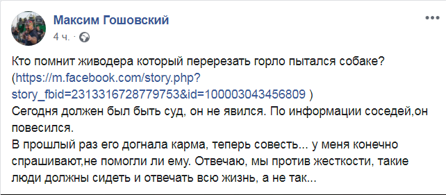 "Кто помнит живодера, который перерезать горло пытался собаке? Сегодня должен был быть суд, но он не явился. По информации соседей, он повесился", - написал Гошовский.