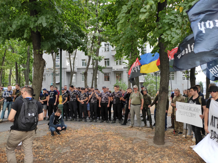До ста представителей организаций "Фрайкор", "Традиции и порядок", "Правый сектор", "Национальный корпус", а также члены общественной организации "Харьковский областной союз ветеранов АТО" вышли на пикет к зданию главного управления полиции. Они держали в руках флаги Украины, символику своих организаций и плакаты: "ЛГБТ и полиция - одна коалиция", "Нет полицейским репрессиям", "Свободу националистам".