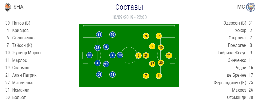 Манчестер Сити: Эдерсон – защитники - Уокер, Отаменди, Фернандиньо, Зинченко – полузащитники - Гюндоган,  Родри – Марез, Де Брюйне, Стерлинг – нападающий Жезус