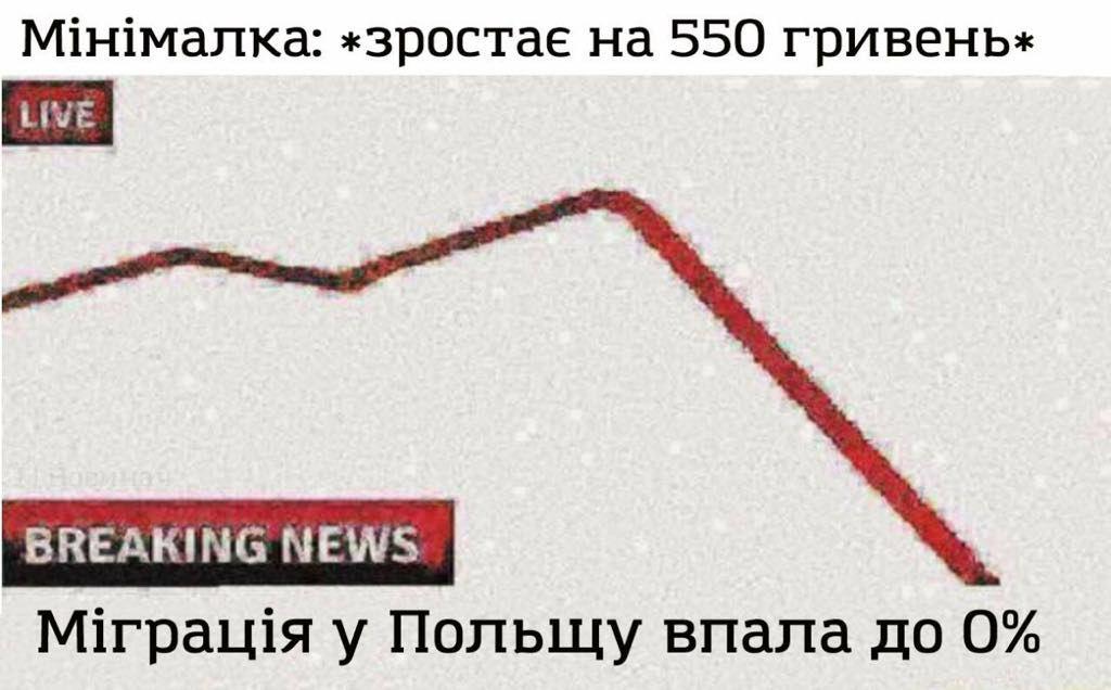 Breaking news "Мінімалка: зростає на 550 гривень. Міграція у Польшу впала до 0%"