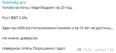 "Читаю на ночь глядя бюджет на 20 год. Рост ВВП 3.3%. Эдак мы 40% роста экономики можем и за 10 лет не достичь... Не иначе, диверсия. Наверное, опять Порошенко гадит", - иронизирует Дубинский.