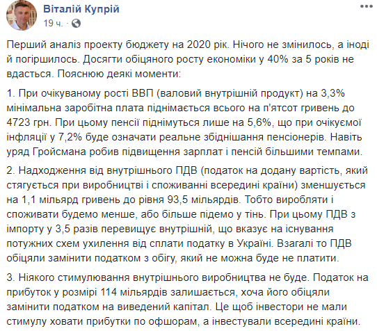 Экс-нардеп Виталий Куприй не нашел содержательных изменений в госбюджете. По его мнению, в бюджете на 2020 год не только ничего не изменилось, но и ухудшилось. Он пояснил в восьми пунктах, почему достичь роста экономики на 40% за 5 лет не получится: