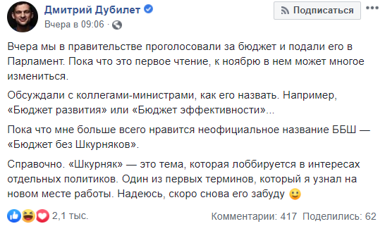 "Обсуждали с коллегами-министрами, как его назвать (бюджет, - Ред.) Например, "Бюджет развития" или "Бюджет эффективности"... Пока что мне больше всего нравится неофициальное название ББШ - "Бюджет без Шкурняков"."Шкурняк" - это тема, которая лоббируется в интересах отдельных политиков. Один из первых терминов, который я узнал на новом месте работы. Надеюсь, скоро снова его забуду", - написал Дубилет.
