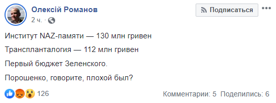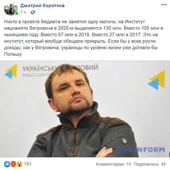 "Никто в проекте бюджета не заметил одну мелочь: на Институт нацпамяти Вятровича в 2020-м выделяются 130 млн. Вместо 105 млн в нынешнем году. Вместо 57 млн в 2018. Вместо 27 млн в 2017. Это на институт, который вообще обещали прикрыть. Если бы у всех росли доходы, как у Вятровича, украинцы по уровню жизни уже догнали бы Польшу", - написал в Facebook Коротков.