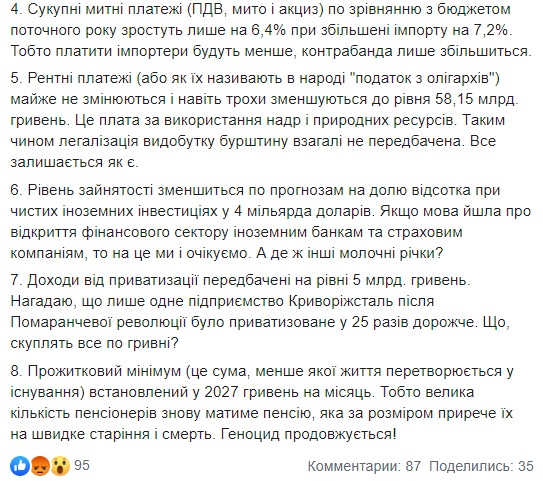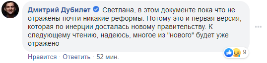"Светлана, в этом документе пока что не отражены почти никакие реформы. Потому это и первая версия, которая по инерции досталась новому правительству. К следующему чтению, надеюсь, многое из "нового" будет уже отражено", - прокомментировал он под постом.