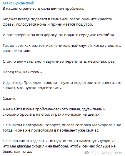 "В нашей стране есть одна вечная проблема. Бюджет всегда подается в свинячий голос, оцените красоту фразы, голосуется ночь и принимается под утро. И вот, впервые за всю дорогу, он подан в середине сентября. Так вот, это как раз тот, исключительный случай, когда спешить явно не стоило. Стоило внимательно и вдумчиво перечитать, несколько раз. Перед тем, как сжечь.