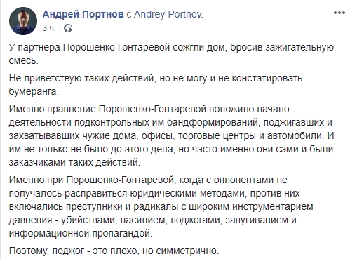 Именно при Порошенко-Гонтаревой, когда с оппонентами не получалось расправиться юридическими методами, против них включались преступники и радикалы с широким инструментарием давления - убийствами, насилием, поджогами, запугиванием и информационной пропагандой. Поэтому, поджог - это плохо, но симметрично".