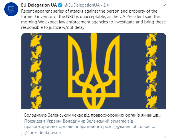 "Недавние очевидные серии нападений на бывшую главу НБУ и ее имущество недопустимы, как заявил сегодня утром президент Украины. Мы ожидаем, что правоохранительные органы безотлагательно проведут расследование и привлекут к ответственности виновных", - говорится заявлении делегации ЕС, опубликованном в микроблоге в Twitter.