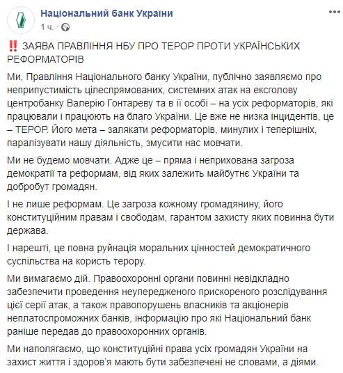 "Это уже не ряд инцидентов, это - террор. Его цель - запугать реформаторов, прошлых и нынешних, парализовать нашу деятельность, заставить нас молчать. Мы не будем молчать. Ведь это - прямая и неприкрытая угроза демократии и реформам, от которых зависит будущее Украины и благосостояние граждан", - говорится в сообщении Нацбанка.