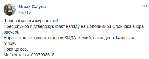 "Пресс-служба подтверждает факт нападения на Владимира Слончака вчера вечером. Сейчас состояние заместителя председателя КГГА тяжелое, наложено 14 швов на голову. Пока это все", - говорится в сообщении.