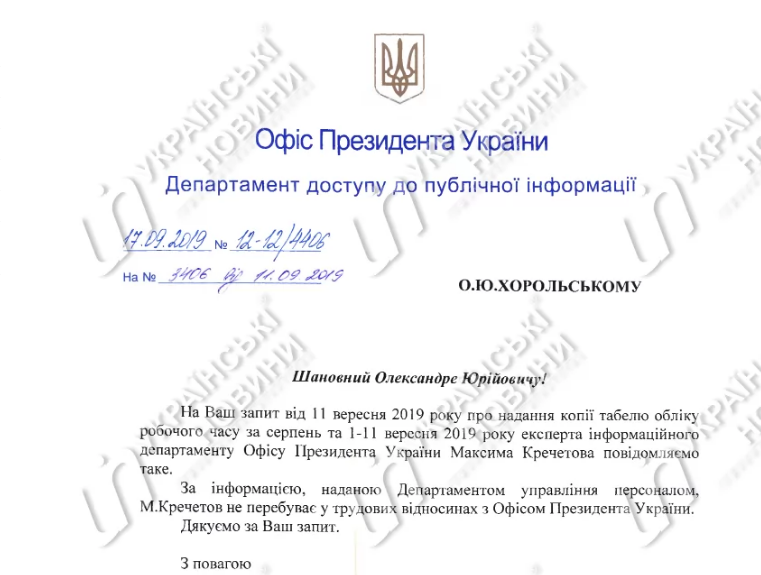 В ответ Офис не смог предоставить копии табелей, поскольку Кречетов не состоит в трудовых отношениях с Офисом президента. "По информации предоставленной Департаментом управления персоналом М.Кречетов не пребывает в трудовых отношениях с Офисом президента Украины", - говорится в опубликованном ответе.