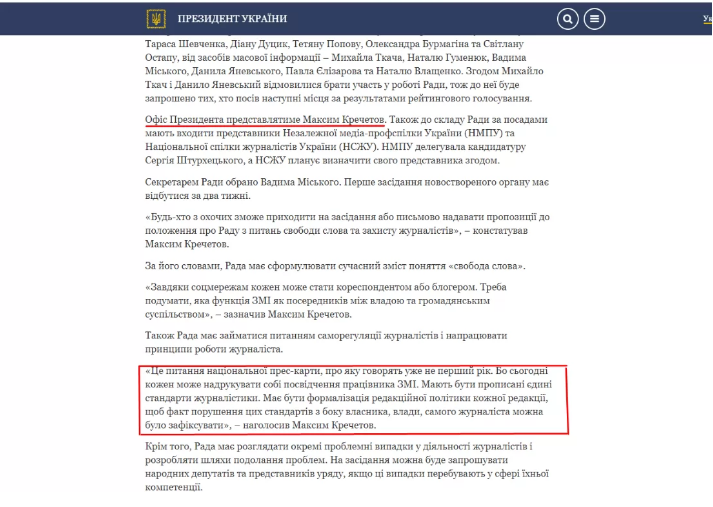 В то же время в сообщении на сайте президента об учредительном заседании Совета по свободе слова и защите журналистов при президенте было сказано, что Офис представлял Максим Кречетов, причем должность Кречетова и другая информация о том в каком статусе он представлял Офис там указана не была.