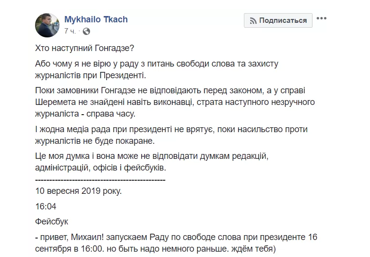 В июле замруководителя Офиса Президента Кирилл Тимошенко объявил об инициативе по созданию Совета по вопросам свободы слова при Президенте. Он также обещал, что в состав Совета войдет по одному представителю от каждой редакции центральных СМИ.