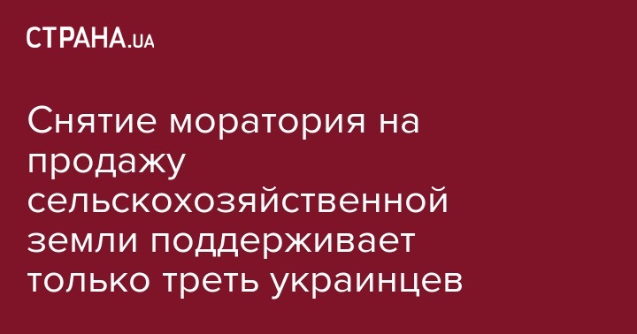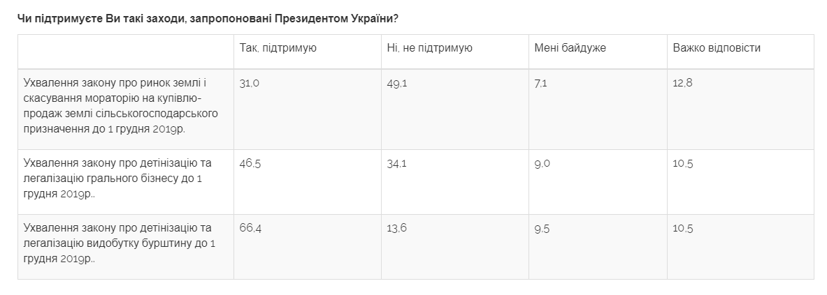 Как сообщается на сайте Центра Разумкова, принятие закона о рынке земли и отмене моратория на куплю-продажу земли сельскохозяйственного назначения до 1 декабря 2019 года поддерживает 31% опрошенных. Не поддерживает эту инициативу 49,1%.