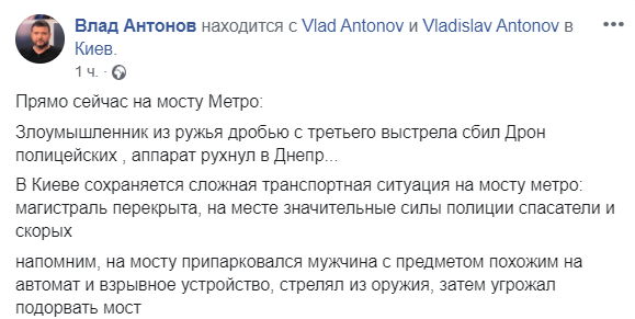 Захвативший мост Метро в Киеве мужчина открыл огонь из ружья и сбил полицейский дрон. Об этом сообщил журналист Влад Антонов на своей странице в Facebook.