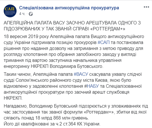 В Апелляционной палате Высшего антикоррупционного суда Украины дали разрешение на заочное задержание для привода в суд фигуранта дела "Роттердам +", экс-замначальника отдела управления энергорынка Национальной комиссии, осуществляющей регулирование в сферах энергетики и коммунальных услуг (НКРЭКУ) Владимира Бутовского.
