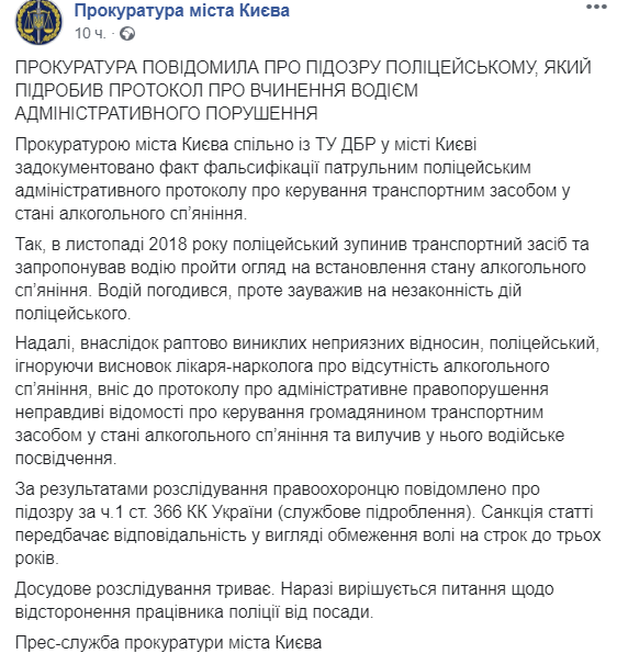 Прокуратура Киева сообщила о подозрении сотруднику патрульной полиции, который подделал протокол об управлении транспортным средством в пьяном виде. Об этом сообщает пресс-служба прокуратуры Киева.