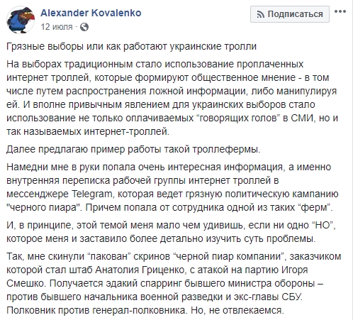 Позже оказалось, что у этой империи фейковых комментариев была солидная клиентура. В частности, по данным СМИ - партия Святослава Вакарчука "Голос" и "Гражданская позиция" Анатолия Гриценко.