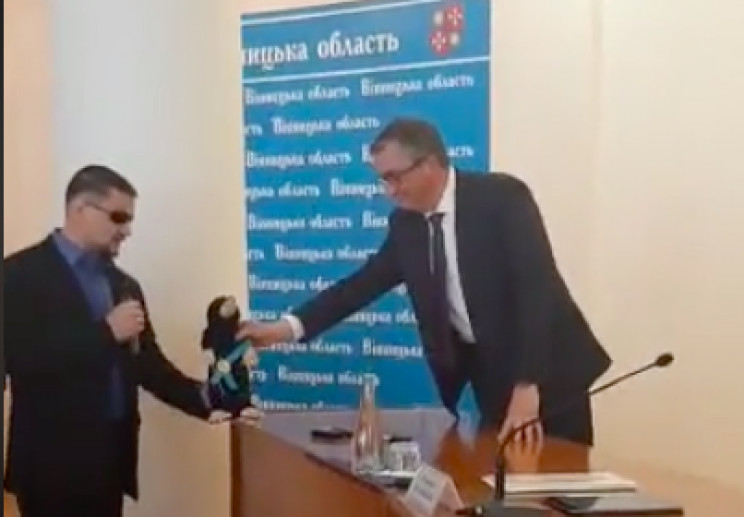 Новоназначенному главе ОГА Владиславу Скальскому Ильницкий подарил мягкую игрушку - крота и попросил держать в своем кабинете, как напоминание о проблемах незрячих людей.