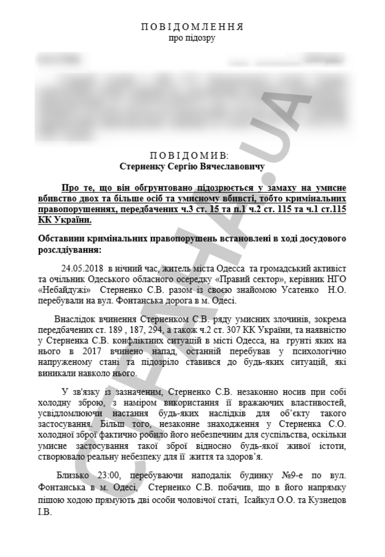 В распоряжении "Страны" оказался текст подозрения Сергею Стерненко - одесскому радикалу, который в мае 2018 году зарезал жителя Черноморска Ивана Кузнецова и ранил одессита Александра Исайкула.