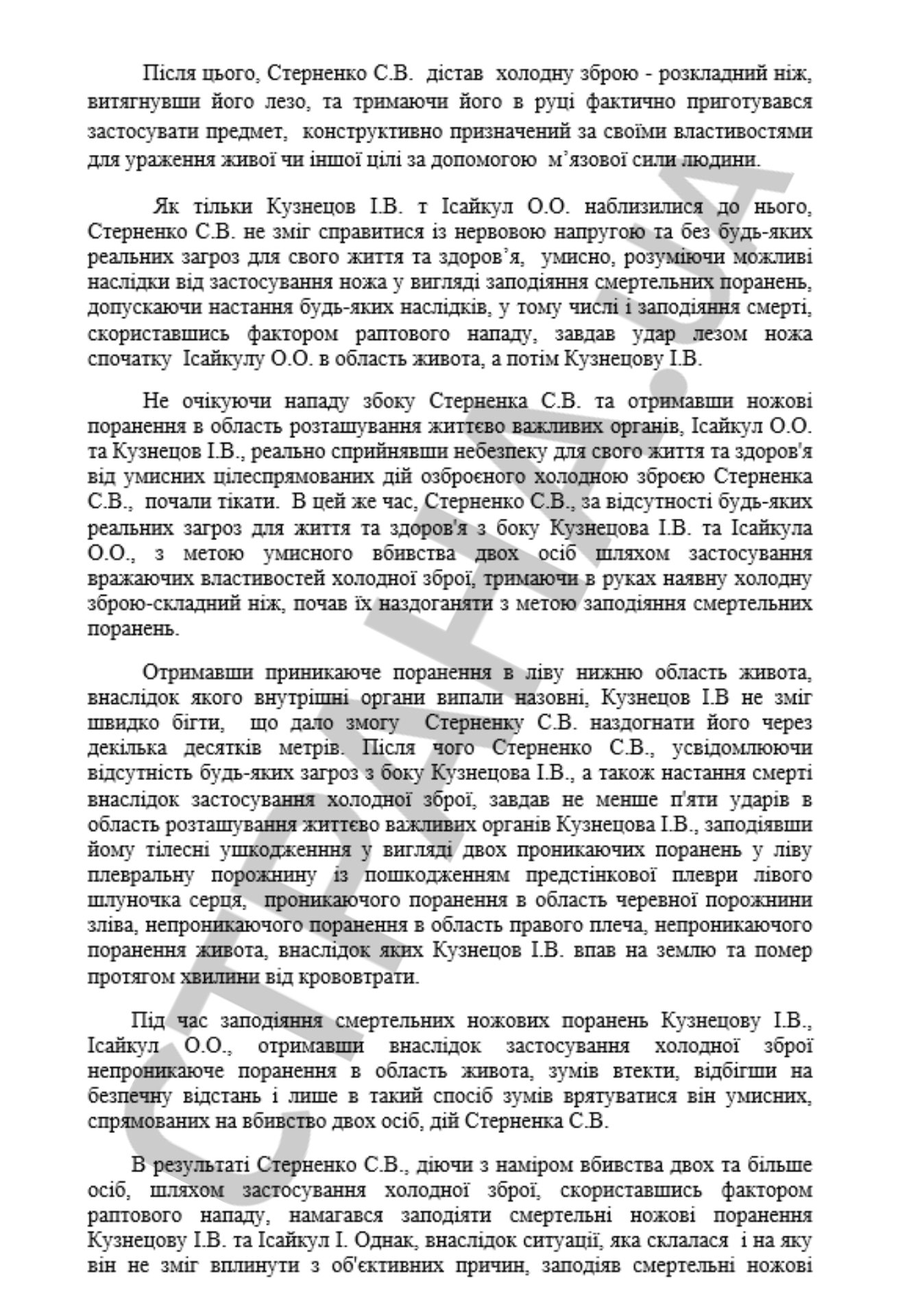 Когда Стерненко увидел Кузнецова и Исайкула идущих по улице, он первым напал на них "без каких-либо угроз своей жизни и здоровью" и нанес им тяжелые раны. Не ожидавшие нападения жертвы радикала бросились бежать. Но Стерненко, намереваясь, по мнению полиции, убить обоих, бросился их догонять.