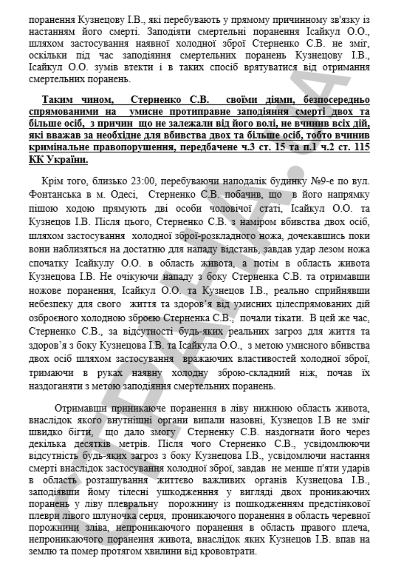 Кроме того, около 23:00, находясь недалеко от дома №9-е по ул. Фонтанская в г.Одессе, Стерненко С.В. увидел, что в его направлении пешком направляются два человека мужского пола, Исайкул А.А. и Кузнецов И.В. После этого, Стерненко С.В. с намерением убийства двух человек, путем применения холодного оружия-раскладного ножа, дождавшись пока они приблизятся на достаточное для нападения расстояние, нанес удар лезвием ножа сначала Исайкулу А.А. в область живота, а затем в область живота Кузнецову И.В. Не дожидаясь нападения со стороны Стерненко С.В. и получив ножевое ранение, Исайкул А.А. и Кузнецов И.В., реально восприняв опасность для своей жизни и здоровья от умышленных целенаправленных действий вооруженного холодным оружием Стерненко С.В., начали убегать. В это же время, Стерненко С.В., при отсутствии каких-либо реальных угроз для жизни и здоровья со стороны Кузнецова И.В. и Исайкула А.А., с целью умышленного убийства двух лиц путем применения поражающих свойств холодного оружия, держа в руках имеющееся холодное оружие-складной нож, начал их догонять с целью причинения смертельных ранений.