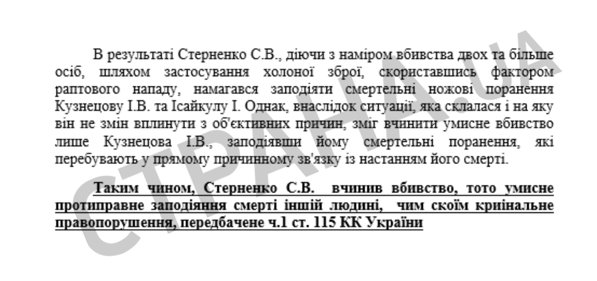 Таким образом, Стерненко С.В. совершил убийство, то есть умышленное противоправное причинение смерти другому человеку, чем совершил криминальное правонарушение, предусмотренное ч.1 ст. 115 УК Украины".