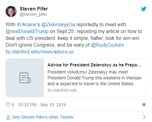 Экс-посол США в Украине Стивен Пайфер дал несколько советов президенту Украины перед переговорами Владимира Зеленского с американским президентом Дональдом Трампом. Об этом говорится в твиттер-микроблоге американского дипломата.