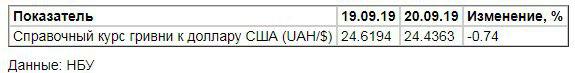 Справочный курс гривни к доллару США на межбанковском валютном рынке по состоянию на 12:00 кв 20 сентября 2019 года упал до 24,4363 грн/$1, то есть ниже психологической отметки в 24,5 грн/$1. Об этом свидетельствуют данные НБУ.