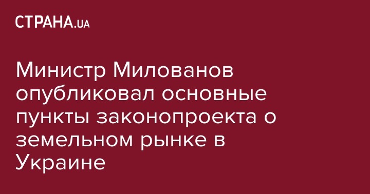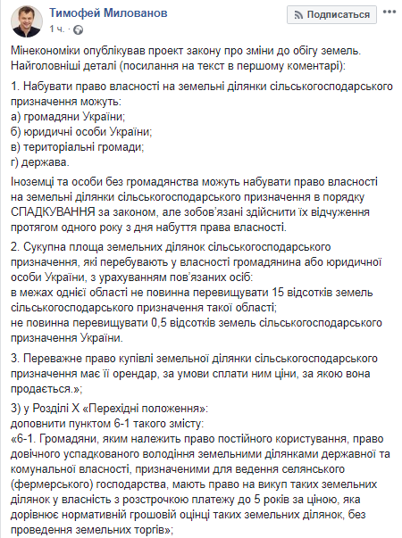 После того как Министерство экономики опубликовало проект закона об обороте земель сельскохозяйственного назначения, министр экономического развития и торговли Тимофей Милованов обнародовал самые важные, на его взгляд, положения документа. Соответствующий пост он опубликовал в Facebook.
