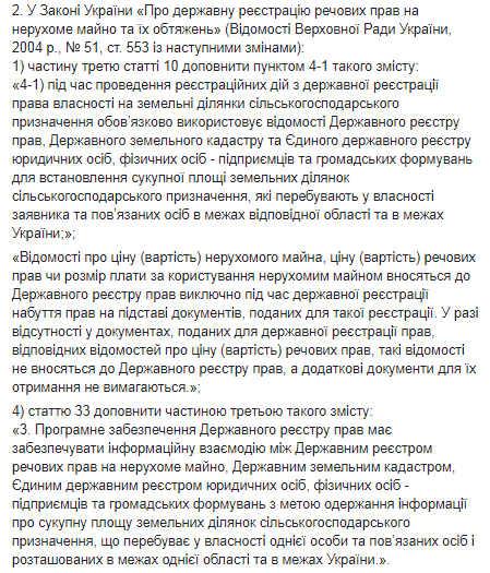 При этом при проведении регистрационных действий по государственной регистрации права собственности на земельные участки сельскохозяйственного назначения обязательно используются сведения Государственного реестра прав, Государственного земельного кадастра и Единого государственного реестра юридических лиц, физических лиц - предпринимателей и общественных формирований для установления совокупной площади земельных участков сельскохозяйственного назначения, находящихся в собственности заявителя и связанных лиц в пределах соответствующей области и в пределах Украины.
