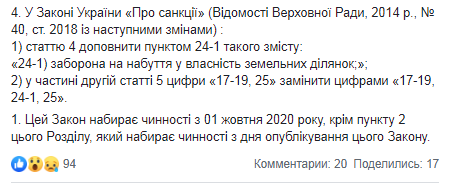 Также предлагается дополнить Закон Украины "О санкциях" статьей о запрете на приобретение в собственность земельных участков.