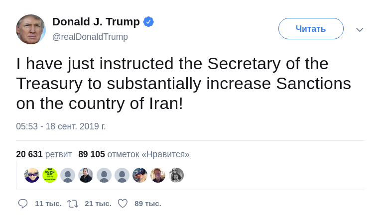 Два дня назад Трамп заявил в Twitter, что поручил министру финансов Стивену Мнучину найти способ существенно ужесточить санкции против Ирана. Поводом для этого стала атака дронов на нефтяное месторождение и завод первичной переработки в Саудовской Аравии.