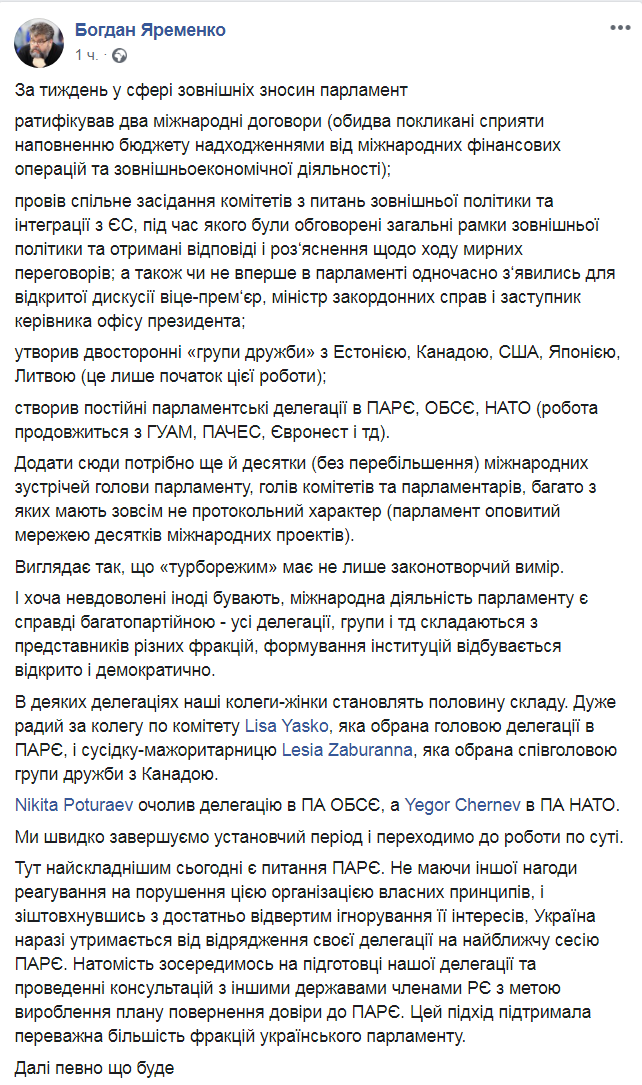 В записи нардеп напомнил, что за неделю в области внешних сношений Рада успела немало. В том числе создала постоянные парламентские делегации в ПАСЕ, ОБСЕ и НАТО. По словам Яременко, ВР быстро завершает учредительный период и переходит к работе по существу. Однако до сих пор сложным и нерешенным остается вопрос ПАСЕ.