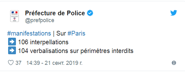 По данным правоохранителей Парижа, к вечеру 21 сентября уже задержаны 106 протестующих, а еще 104 человека оштрафованы.