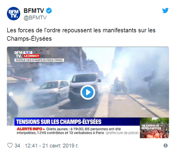 По сведениям телеканала BFM, сегодня полиция применила слезоточивый газ против группы демонстрантов, которые направлялись на Елисейские поля.
