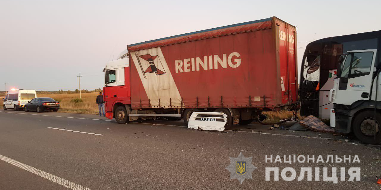 Уточняется, что двигавшийся в сторону Харькова грузовик столкнулся с припаркованным на обочине пассажирским автобусом. От удара тот наехал на трех мужчин, которые стояли перед ним. После столкновения с автобусом грузовик протащило вперед и он въехал в еще одну машину на обочине.