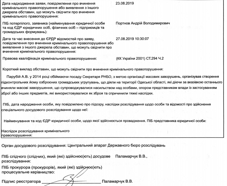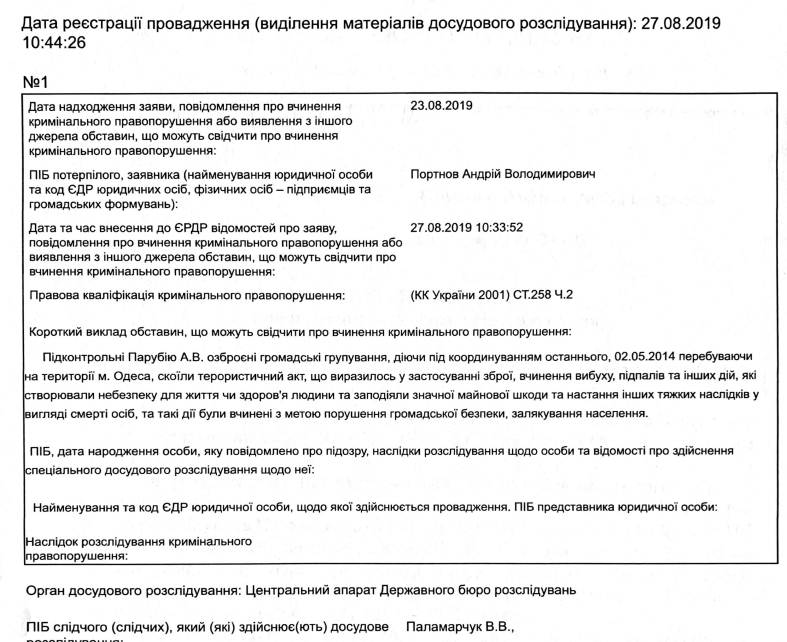 27 августа Государственное бюро расследований по заявлению Андрея Портнова открыло уголовное производство против тогда еще спикера Андрея Парубия - по факту массовой гибели людей в одесском Доме профсоюзов 2 мая 2014 года.