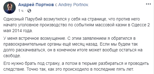 На пост Парубия отреагировал заявитель по его делу - Андрей Портнов, который написал: "Одиозный Парубий возмутился у себя на странице, что против него начато уголовное производство по событиям массовой казни в Одессе 2 мая 2014 года.