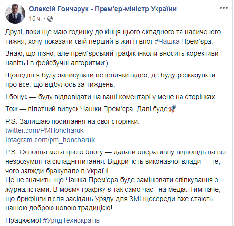 Премьер-министр Украины Алексей Гончарук запустил видеоблог (влог) с названием "Чашка премьера". Его первый выпуск опубликован 22 сентября 2019 на его официальной фб-странице.