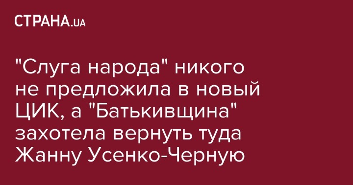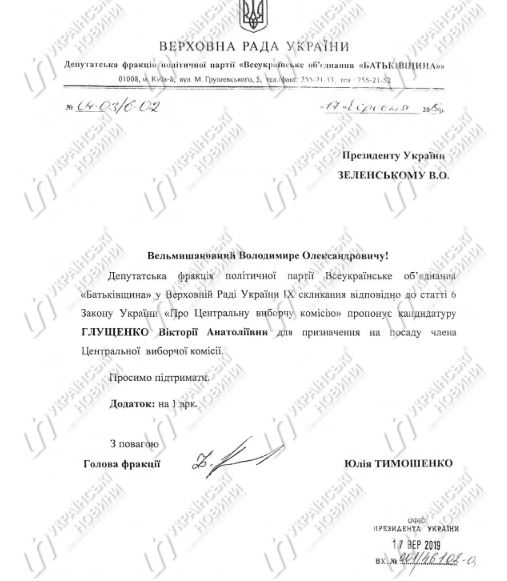Фракция "Всеукраинское объединение "Батькивщина" публично сообщала лишь о внесении президенту кандидатуры главного консультанта отдела представительства в судах секретариата ЦИКа Виктории Глущенко. В то же время, согласно ответу Офиса президента, 16 сентября на имя Зеленского поступило подписанное председателем "Батькивщины" Юлией Тимошенко предложение о назначении Жанны Усенко-Черной - экс-члена ЦИКа от "Батькивщины" в 2004-2018, в том числе заместителя председателя комиссии с 2007 года. 17 сентября "Батькивщина" также внесла Зеленскому кандидатуру Глущенко для назначения членом ЦИКа, при этом в письме не говорится, что кандидатура Глущенко вносится вместо Усенко-Черной.