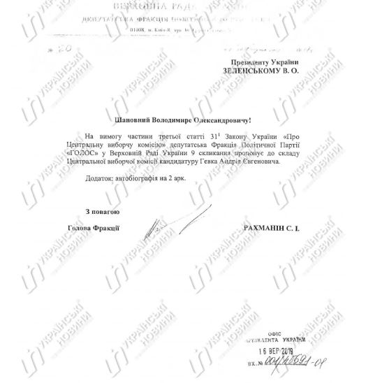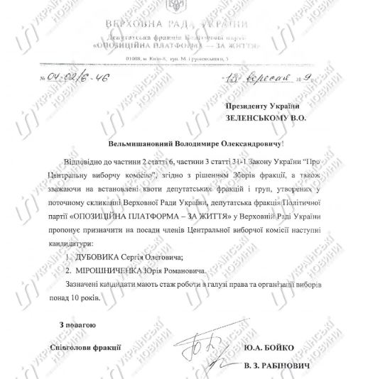 Согласно ответу Офиса президента, своевременно свои предложения внесла только фракция "Оппозиционная платформа - За жизнь". 13 сентября ОПЗЖ предложила Зеленскому две кандидатуры на должность членов ЦИКа: заместителя руководителя секретариата ЦИКа Сергея Дубовика и бывшего депутата парламента Юрия Мирошниченко.