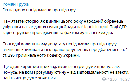 "Сегодня бывшему депутату сообщили о подозрении в совершении уголовного преступления, предусмотренного ч. 1 ст. 296 Уголовного кодекса Украины (хулиганство - Ред.). Еще один хороший пример, иллюстрирующий очень простую, но почему-то не всем понятную истину - от ответственности не уйти, даже если очень хочется", - написал Труба.