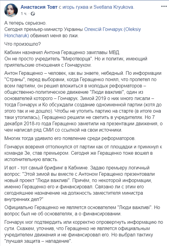 Журналист "Страны" Анастасия Товт объяснила за что премьер-министр Украины Алексей Гончарук обвинил ее во лжи во время брифинга в Кабинете министров, после вопроса о назначении Антона Геращенко заместителем главы МВД. Соответствующий пост опубликован в Facebook.