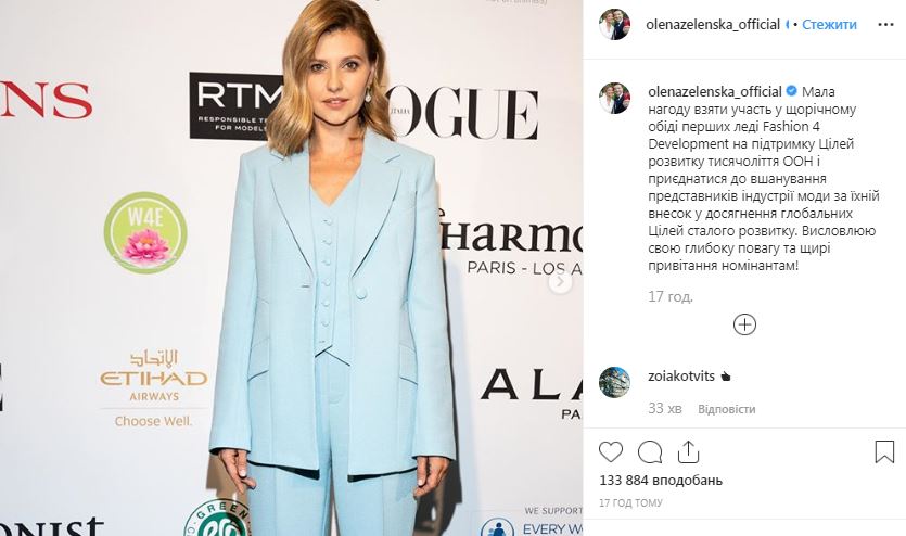 "Имела возможность принять участие в ежегодном обеде первых леди Fashion 4 Development в поддержку Целей развития тысячелетия ООН", - написала она. Также Зеленская рассказала, что присоединилась к чествованию представителей индустрии моды. "Выражаю свое глубокое уважение и искренние поздравления номинантам", - сообщила она.