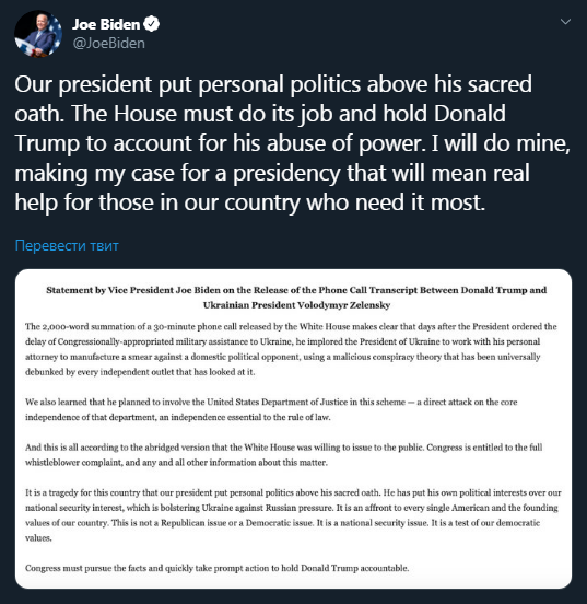 "Наш президент поставил личную политику выше своей священной клятвы. Белый дом должен выполнить свою работу и привлечь Дональда Трампа к ответственности за злоупотребление властью. Я постараюсь сделать все возможное, чтобы выдвинуть свою кандидатуру на пост президента, что будет означать реальную помощь для тех, кто в нашей стране нуждается в ней больше всего", - написал Джо Байден в Twitter.