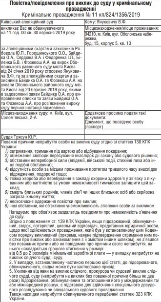 "Киевский апелляционный суд вызывает вас как обвиняемого на 11:00 30 сентября 2019 года", - сказано в повестке.