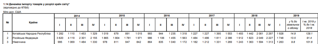 Из данных Нацбанка видно, как доля России неуклонно падает по обоим показателям. В 2014 году экспорт с РФ составлял 2339 млн долл., в 2018-м -  уже 772 млн. Импорт товаров из РФ упал с 3820 в 2014-м до 2227 в прошлом году. А из Китая врос с 1282 млн долл в 2014-м до 2297 млн долл. в 2018-м.