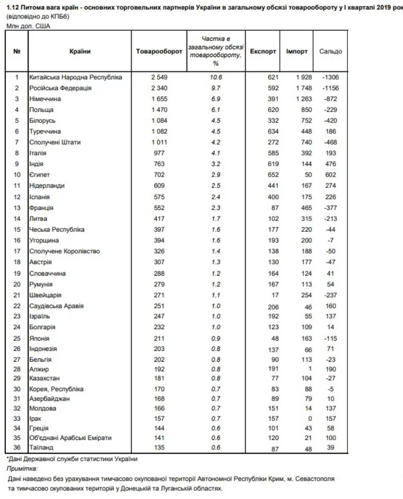 Среди крупнейших торговых партнеров Украины также числятся Германия, Польша, Беларусь, Турция и США.