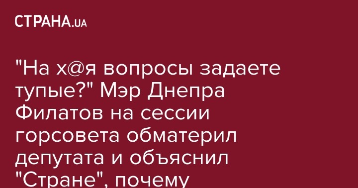 "Да, матюкался. Это я так пытался объяснить депутатам, чтобы они не задавали тупых вопросов. Вот они спрашивают: а где мы можем посмотреть прозрачность продажи коммунальной собственности? Я спрашиваю: а вы знаете, что такое платформа Prozorro? Они говорят: "Знаем". Снова спрашиваю: А вы в курсе, что по данным программы Prozorro, Днепр стоит на четвертом месте среди всех территориальных общин? Оказалось, депутаты знают и это. Еще спрашиваю: "А вы знаете, что мы выставили 30 объектов на Prozorro для продажи? И это они знают. Так а на х@я вы тупые вопросы задаете? Они до этого тролили меня своими идиотскими вопросами, падали на пол - говорили, что их кто-то побил. Там есть трое их Самопомощи и один из БПП, которым лень работать, не лень дурака валять", - рассказал "Стране" Борис Филатов.
